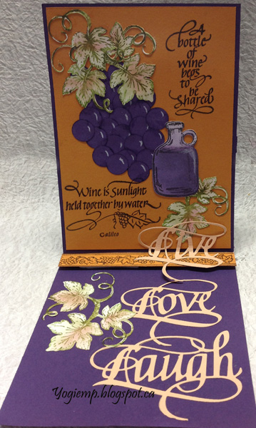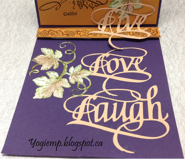 On the floor: Stamped the border of grapevines (Heartfelt Creations "Italiana Grape Borders") with the purple, clear embossed on the pumpkin cardstock. Trimmed down and adhered to floor with 3D foam tape to act as my stopper. Die cut the words from a light peach Bazzill Monochromatic cardstock. Adhered the "Live" to the stopper and the other 2 words on the floor. Added a sprig of the grapevines. |