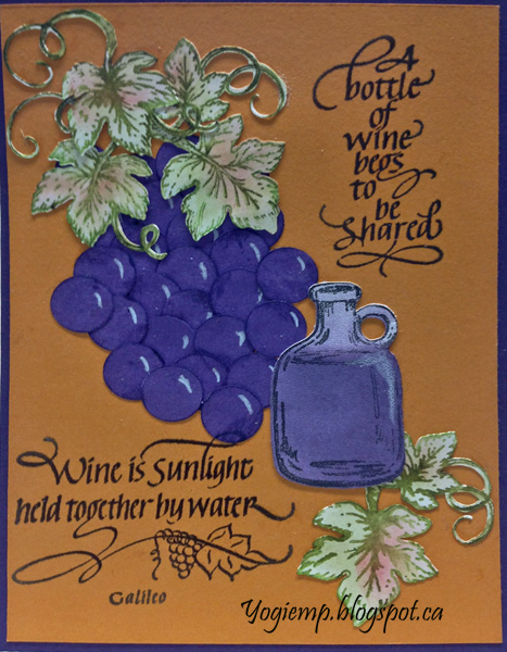 Created the grapes by punching out circles from the purple cardstock, inking the edges of each with a Distress "Dusty Concord" mini pad, adhering them in place and then using a white Prisma colored pencil for the highlight mark. Created an electronic cut file of the leaves, jug and various other elements from the sets (Heartfelt Creations "Jars and Vines"; "Italiana Grapevines"). Cut from white cardstock and inked with Distress pads, blending colors with a wet paint brush. Stamped the quotes using Versafine "Imperial Purple" and clear embossed. |