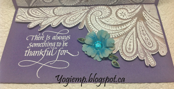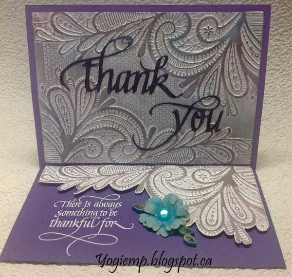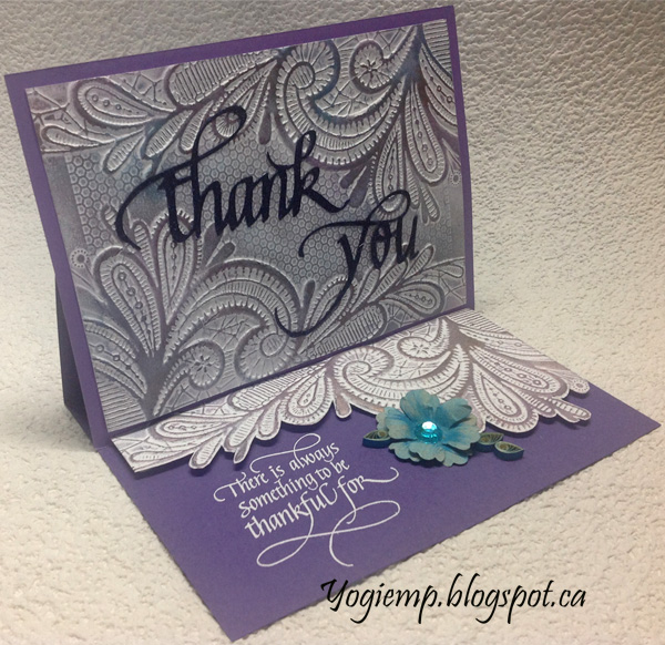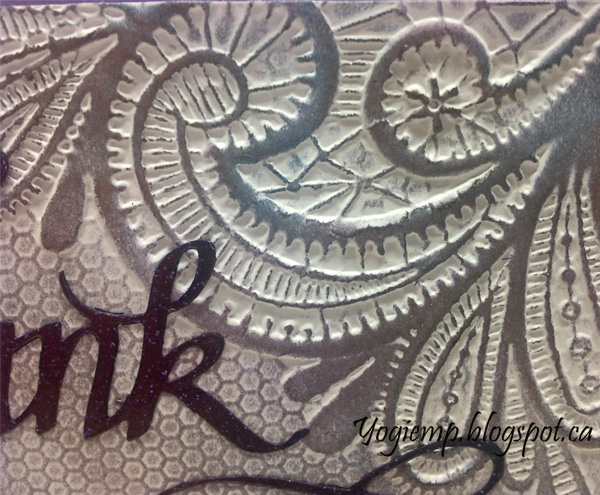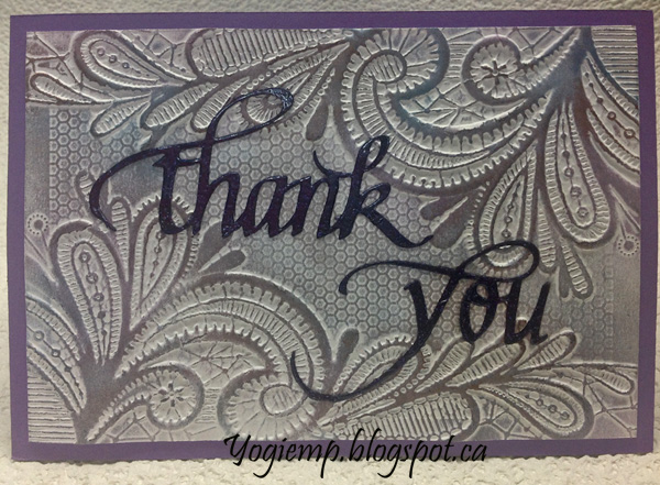 Cut another piece same size as card and adhered to front. I ran my white cardstock through my embossing machine using the Ornate Lace folder. NOTE: highly recommend lightly misting the back of your cardstock prior embossing or else you will get lots of cracking in your cardstock... I used my finger to rub on Metallic Rub On paste in various colors. Trimmed down and adhered to card front. Die cut the "Thank You" from a purple cardstock, inked with Emerald Creek "Frosted Plum" embossing powder. |