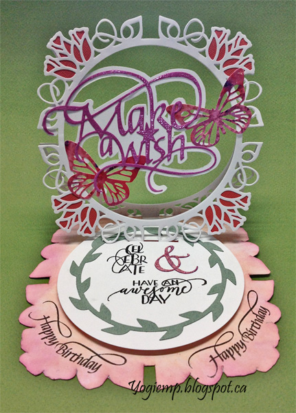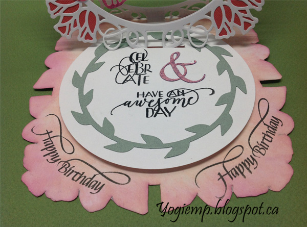 On the floor: Used the drop out circle to create my base. Die cut the leafy circle from the set and adhered to circle. Used my Tim's Stampin Platform and stamped the text using Versafine Black Onyx and clear embossed. Die cut the ampersand from another pink cardstock. Cut a slit in the circle to insert the front to use as my stopper. Adhered the circle to the floor with 3D foam tape. Stamped the "Happy Birthday" twice. PS: I cut a little 'v' between the flourishes so I cut curve my text...