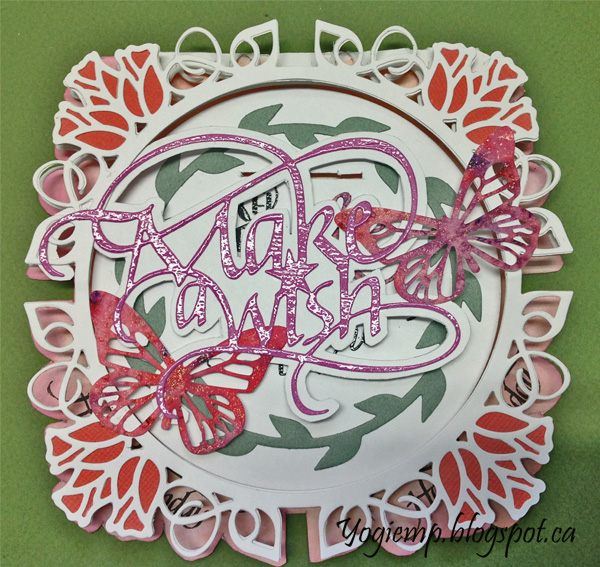 Die cut the wreath again from white cardstock twice more. Die cut the little rosebud inserts from a deep pink textured cardstock and adhered in place on one of the above die cuts. Adhered this layer to the front of the easel card. The extra die cut I adhered to re-enforce the layers, half on the card base piece and the other half on the top/back of the front piece. Die cut some butterflies from previously decorated papers done with Brusho's and Color Burst powders. Clear embossed and adhered around the circle. Die cut the "Make a Wish" from a pink cardstock. inked with Versamark and clear embossed. Created a shadow layer by cutting around the die shape and some of the larger interior shapes. Adhered both layers together and then onto the circle. |