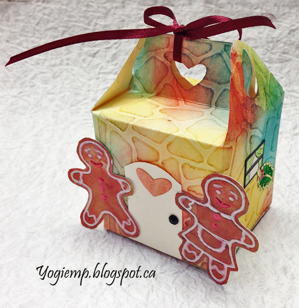 Ran through with Elizabeth Craft Designs "Sea Glass" embossing folder. Inked with Distress pads in various colors. Die cut the gingerbread people (Elizabeth Craft Designs) from cream cardstock and inked with Distress browns. Used Liquid Pearls "White Opal" like icing... adding some red for the mouth and buttons. Fussy cut a door, adhering the drop out heart from the Gable Box die cut. Added a black rhinestone for a door handle. On either side I fussy cut a little window adding some gold Peel Off Holly leaves (Elizabeth Craft Designs) filled with glitter. Final touch added a narrow burgundy ribbon to hold the box closed. |