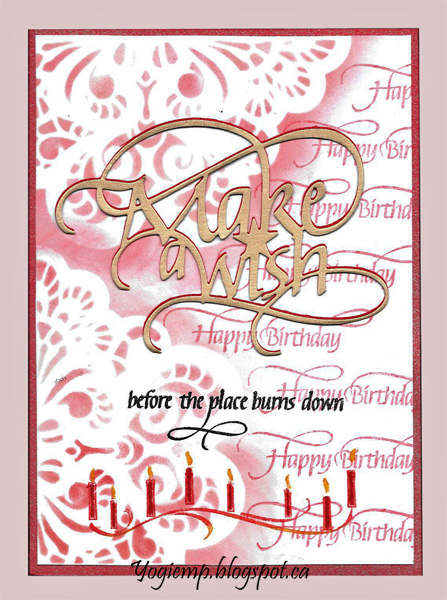 I had die cut on my desk from Moda Scrap - the lace pocket which I had cut in half. Used the other half on a card, so played with this half using it as a stencil and sponging with Distress "Festive Berry". Stamped the "Happy Birthday" with the red, repeatedly to create a background. Stamped the sentiment using Versafine Black Onyx and clear embossed. Stamped the candles with red and "Mustard Seed" and clear embossed, then colored with markers. Die cut the "Make a Wish" from a gold cardstock and a red cardstock and layered the two together, then onto the card. |