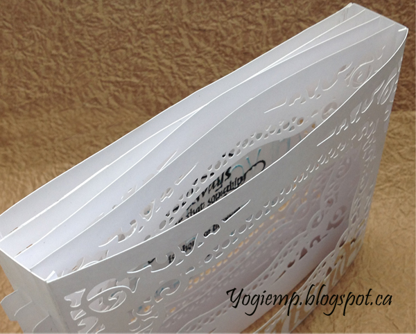 The largest die in the set doesn't cut an outside edge which is the type of die best suited to creating these types of cards. Cut 5 layers from white cardstock using the largest die. Place the next largest die from the set that also doesn't have an outside cut edge centered in one of the above die cuts. Run through your machine and use this as a template to position the die for the next 3 layers. (PS the 5th die cut is for the back and doesn't get the die cut opening), (PPS keep the drop outs - one for the last layer and the rest for other cards...) Took 3 of the die cuts, stacking them and taping them together so they wouldn't move when I trimmed them down, (I left approx a 1/16 to 1/8" border on the left and right sides of the fancy cut outs, plus the 1/2 tabs). Untapped them. Used one of these trimmed pieces to cut my front and back pieces - minus the tabs I cut my 2 vertical side pieces at one time so they would be exactly the same... the height of the card by 1.5"w. This gave me a 1/4 on either side to attach to my front and back pieces. And 3 slots at 1/4 apart. Scored and burnished the folds. I cut little off cuts of my tabs as well as a small slit so the tabs don't fall out. You can watch Becca's assembly video HERE