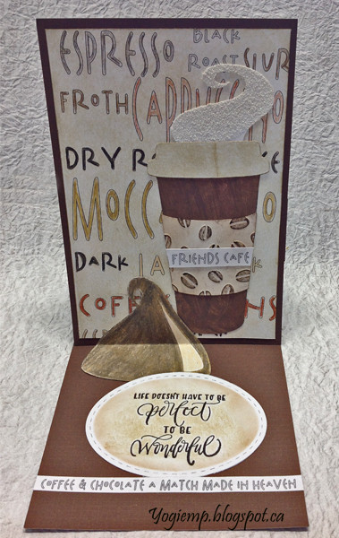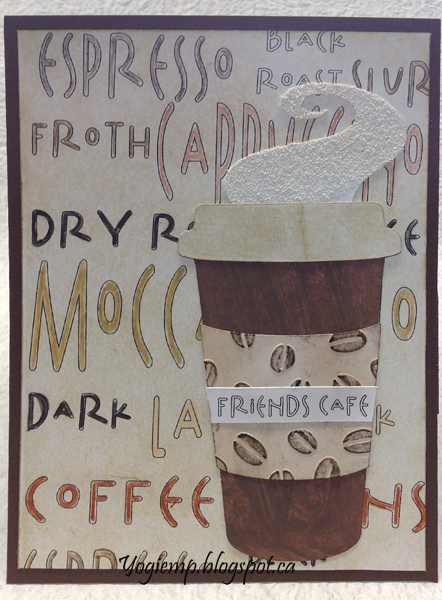 On page 2, I created my background using the Chalkline font and a bunch of coffee related words in various sizes. Resized the lot to fit my card base. Printed out on white cardstock. Colored the letters with Prisma colored pencils, then went over the whole page with a Distress "Antique Linen" pad (PS mine is a bit dry, I'm lazy and don't fill them very often...) Scored and folded my dark brown textured cardstock to create the easel. Adhered another piece same size as card. Then adhered my text background and the coffee cup. Added the "Friends Cafe" on the cup. |