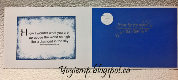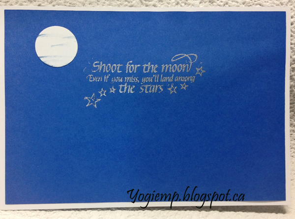 On the inside - right side: Adhered a piece of the deep blue paper. Stamped the quote using Versamark and embossing with silver embossing powder. Punched out a 1"circle from white cardstock. Put some blue streaks through the moon and adhered to inside. |