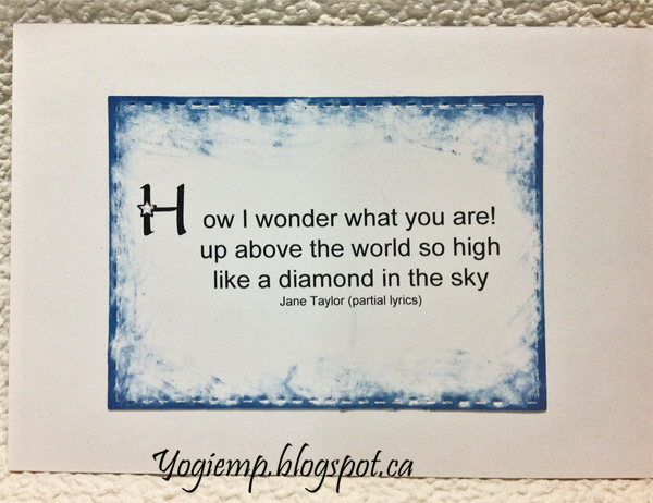On the inside - left side: In Excel, I created the text for the lyrics in Arial font and the letter "H" using "You're a Star" OTF font. Printed out on white cardstock. Die cut with Elizabeth Craft Designs "Stitched Rectangles" die set. Inked around edges direct to paper with Distress "Faded Jeans"