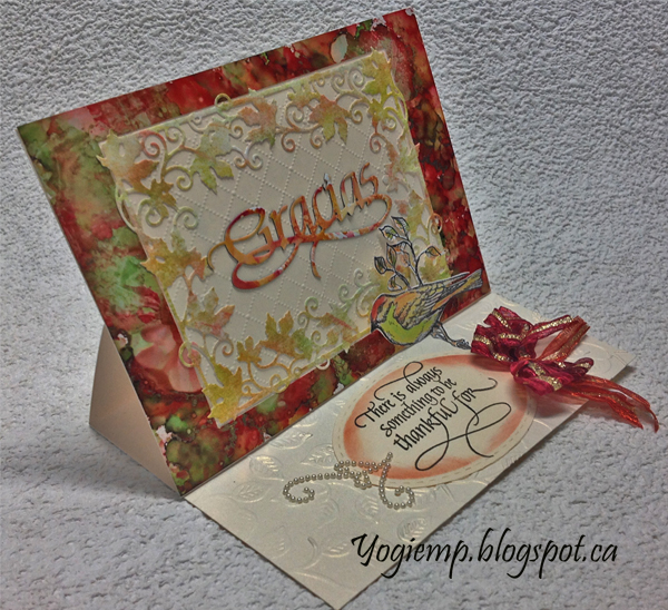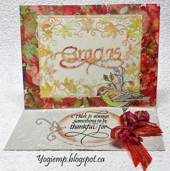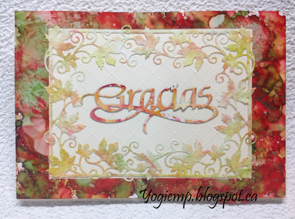 Die cut the leaf border (Tutti Designs "Maple Leaf Frame") from a distress decorated linen cardstock. Adhered to front. Die cut the "Gracias" from another piece of alcohol background created on glossy paper. |