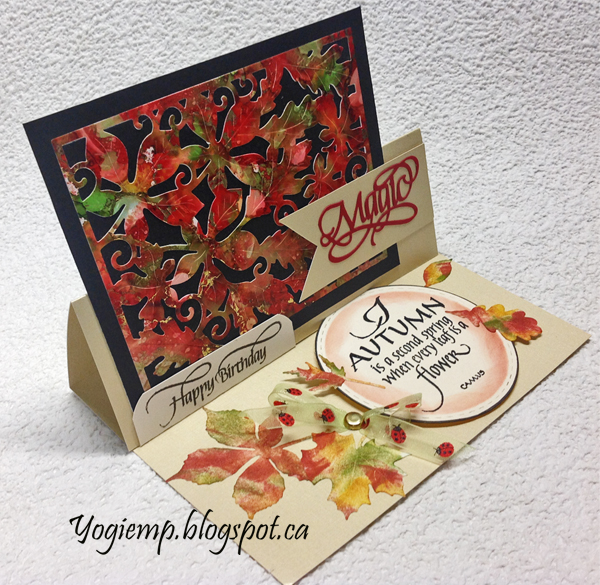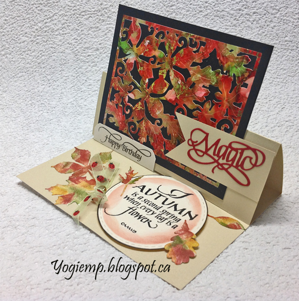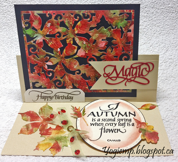Created: August 24, 2018 I created 3 cards with 1 alcohol background from a 5 x 7" piece of Yupo - this one is a positive die cut and is the 1st in the series... You can see the others HERE (negative pieces) and HERE (the frame) I'm using an A Way With Words dies "Magic" from Elizabeth Craft Designs, also available on Quietfire Design HERE And I'm using a quote stamp from Quietfire Design ("Autumn Is A Second..."); And a clear sentiment stamp ("Birthday Collection" 8pce set) also available from Elizabeth Craft Designs HERE.