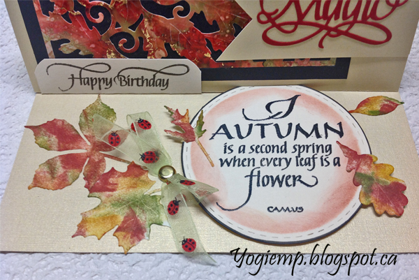 On the floor: Stamped the quote using Versafine Black Onyx and clear embossed on cream cardstock. Die cut with Elizabeth Craft Designs "Stitched Circles" die set, sponged some "Candied Apple" around the edges. Used a Zig black marker and edged the circle. Cut off a small piece so I had a flat edge. Adhered to floor with 3D foam tape to act as my stopper. Die cut the leaves (Impression Obsession) from an Oxide decorated cardstock. Randomly adhered. Tied a faux bow from a ladybug gauze ribbon and added the gold circle brad. Stamped the "Happy Birthday on cream cardstock. clear embossed and adhered to floor to help as my stopper. |