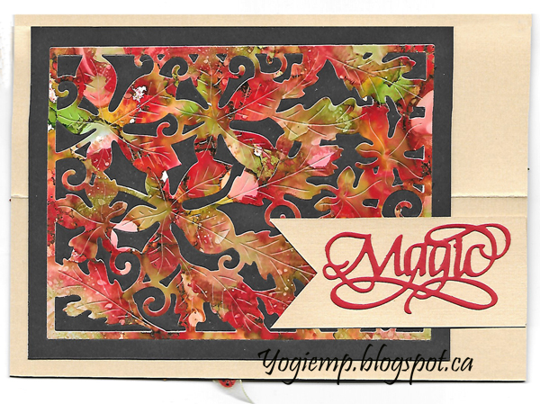 Created the alcohol background from a 5" x 7" piece of white Yupo using a "Butterscotch", "Poppy Field" and "Botanical" alcohol ink and blending solution. Since my die cut (Tutti Designs "Leaves Background") is only 4 x 5.25" I was able to create a frame from the leftover Yupo. Adhered to a piece of black cardstock and then onto my card front. Die cut the "Magic" from red cardstock and adhered to a piece of the gold cardstock adding picot edge. |