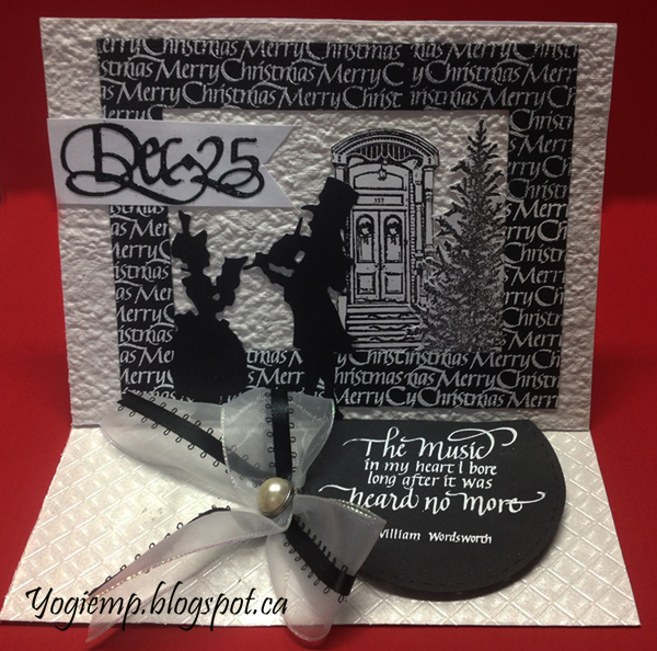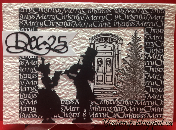 Adhered a piece of Coral Reef paper to front (looks like snow ...). Stamped the Merry Christmas background onto black cardstock using Distress Picket Fence and embossing with white embossing powder. Used my Tim's stampin Platform and repeated stamping to cover a larger area. Die cut with Elizabeth Craft Designs "Stitched Rectangles" die set. (I'll use the drop out and excess pieces for another card...). Stamped the door and the pine tree (both from Old Island Rubber) onto white cardstock using Versafine Black Onyx and clear embossing. Fussy cut where needed and adhered to frame. Electronically cut the carolers from black cardstock. Die cut the "Dec 25" from black cardstock and adhered to a white picot edged cardstock. |