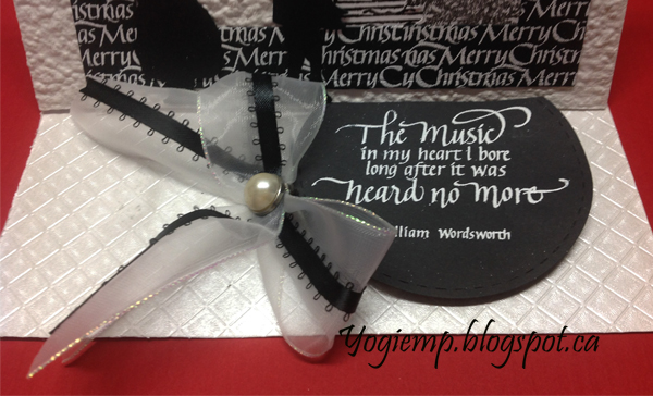 On the floor: Adhered a piece of textured paper (Paper Roots wrapping paper from eons ago...). It has a satiny shiny look. Stamped the quote onto black cardstock using the white and embossing with the white. Die cut with Elizabeth Craft Designs Stitched Circles die set. Cut off the top edge and adhered to floor to act as my stopper. Tired a faux bow using a white gauze ribbon, adhering a black picot edge ribbon with Sookwang tape and attaching a pearl brad to the center to hold the bow together, then used hot glue to adhere to card floor. |