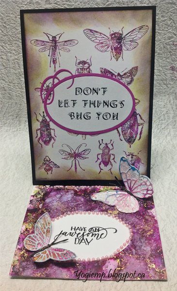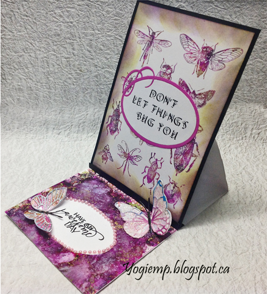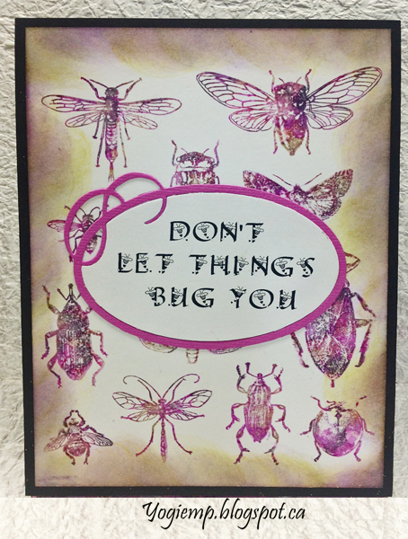 Created the alcohol background on Yupo. Stamped the bugs (Tim's "Entomology" set) using the Alcohol Lift ink pad and stamping on white cardstock. Trimmed down, sponged various Distress colors around edges then adhered to card front Used the "Alpha Bee" font in my word processor and printed on white paper. Die cut with the flourished oval. Die cut one from the fuchsia cardstock. Adhered elements of both to card front. |