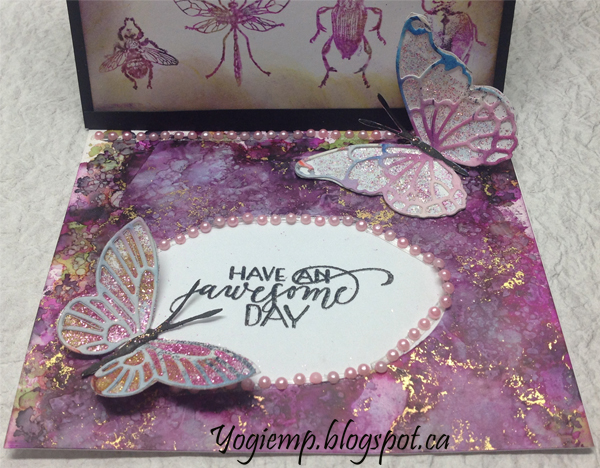 On the floor: I didn't like the results of the alcohol lift on my background, so continued sponging blending solution and then pressing gold leaf into the dampness - love it... Die cut an oval using Stitched Rectangles (Elizabeth Craft Designs) - the drop out piece I'm keeping for another project. Adhered the alcohol background to card floor. Used my Tim's Stampin Platform to stamp the quote using Versafine Black Onyx and clear embossed. Trimmed the oval with small pink pearls. Die cut a couple butterflies (Memory Box "Vivienne" and "Kaleidoscope") from an art piece I didn't like... Cut out solid images of the butterflies from white cardstock, smeared with white glue, adhered the butterfly and sprinkled with glitter. Adhered to card floor. |