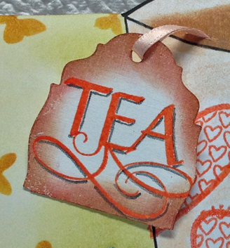 I outlined my design with a black marker. I created some masks from copy paper where needed - for the liquid in the cup, and the left edge of the cup/saucer. Stamped the heart/hearts using Versafine "Habanera" and clear embossing. Inked the outline heart stamp with the Habanera and clear embossed. Sponged some Distress "Tea Dye" for the liquid. Used the side edge of colored pencils to color the cup and saucer. Sponged Distress "Crushed Olive" around the cup background. Lay the stencil on the background and sponged with some "Mustard Seed" and "Fossilized Amber". Stamped the "Tea" with the Habanera, clear embossed on white cardstock. Added a shadow line with an HB pencil. Dye cut with Tim's "Stacked Baroque" die set and then cut off the bottom edge, sponged with the tea dye. Punched a hole and added the ribbon. Made a slit in the cup liquid and adhered the ribbon to the back. |
