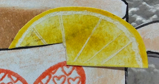 Die cut the "Hugs from a blue textured cardstock and adhered. Stamped the "Mine, you're..." on white with the Habanera, trimmed down adding a picot edge, sponged around the edges and adhered to front. Created the lemon by cutting a half circle. Used an orange/yellow colored pencil for the rind edge. Left a white rim and colored the rest of the lemon with another yellow pencil. Added white veins with a white gel pen. Cut of part of the lemon slice to make it appear it was sitting on the cup rim. Adhered to cup.( I only like lemon in my tea... dislike milk UGH) |