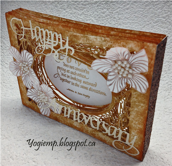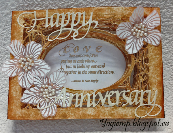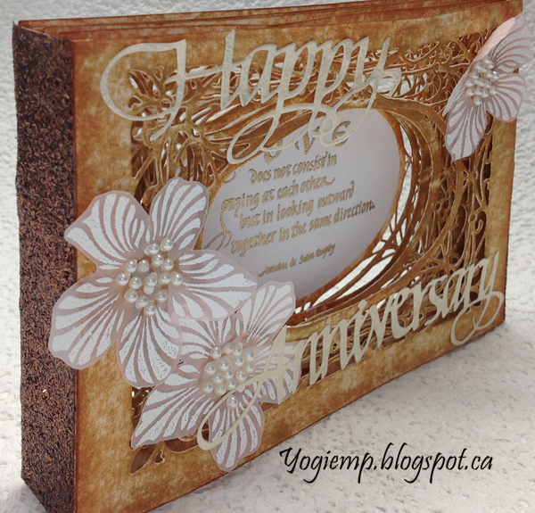 Inked the die cuts using Distress pads direct to paper, first with "Brushed Corduroy" and then around the edges with "Rusty Hinge" Stamped the quote onto one of my drop out ovals using Versafine Black Onyx and clear embossed. Adhered to card back. Assembled the layers, folding the tabs toward the back and adhering them to the side. The applied double sided tape to the whole side piece and adhered the glittered bronze ribbon. Stamped the flowers (Hero Arts "Luscious Frames) on a light pink toned vellum using Distress "Picket Fence" and embossing with white embossing powder. Fussy cut each one... Adhered to card front Die cut the "Happy Anniversary from cream toned cardstock, inked with the Versamark and embossed with Pearlescent embossing powder Adhered to front. As a final touch adhered a bunch of white pearls to the centers of the flowers using a drop of Glossy Accents. |