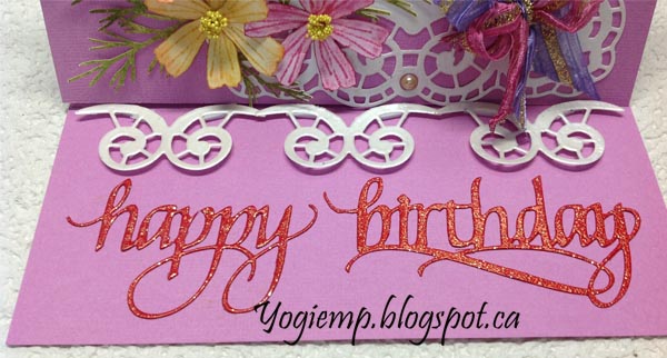 Die cut the "Happy Birthday" from a pinkish cardstock, inked with Versamark and Emerald Creek "Chinese New Year" embossing powder. |