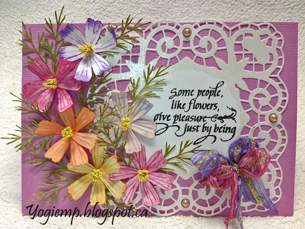 Die cut the Venise Lace Frame (Spellbinders - Beeca Feekan from Amazing Paper Grace blog ) from white cardstock, stamped the quote using Versafine Black Onyx an clear embossed. Used the insert die as a mask and inked the edges with Versamark , embossed with Pearlescent embossing powder. Adhered to card front. Adhered pale amber half pearls. As mentioned above created the cosmos flowers. The centers are rolled, dipped in white glue and the dipped into some yellow Prills. I didn't have a feather type leaf so drew a bunch of lines to look like the leaves, scanned, and electronically cut from green decorate cardstock. Adhered everything to the front. Tied a fork bow using variegated Sari ribbon. |