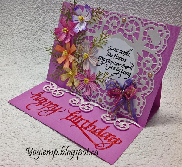 Created: January 28, 2018 As I mentioned recently I spent a day creating flowers... Drew the shapes for Pansies, Jasmine, Dogwood & Cosmos, then proceeded to cut them with my electronic cutter and then scored, colored and shaped them. It was a happy play day... And today I wanted to use my Cosmos... They remind me of my fraternal grandmother. In her front garden was a huge patch of cosmos. Normally they are considered annuals, but she had so many, they propagated themselves each year. It was such a pleasure to see when I visited... I'm using an A Way With Words dies "Happy Birthday Small" from Elizabeth Craft Designs, also available on Quietfire Design HERE I'm also using a quote stamp from Quietfire Design ("Some People Like Flowers...")