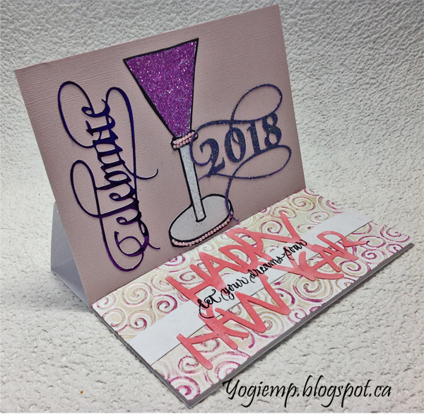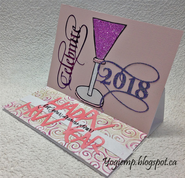 Drew the cocktail glass on some cardstock, outlined with a sharpie and fussy cut around it. Applied "Stick It" and or glue and sprinkled with various glitters. Added some mini pink pearls at the base and center section. Adhered to card front. Die cut the "Celebrate from a purple mirror cardstock. Adhered to front. Electronically cut the "Flourished 2018" from white cardstock, inked with Distress Oxide "Seedless Preserves" and embossed with Emerald Creek "Mardis Gras" embossing powder. |