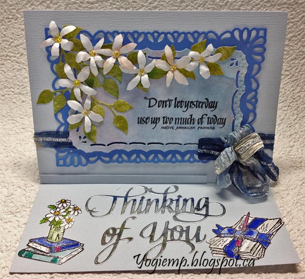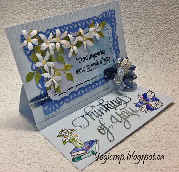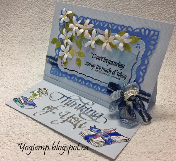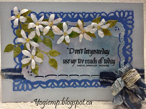 Scored and folded my light blue toned cardstock to create the easel. Cut another piece, same size as card and adhered to front. Die cut the Majestic Elements "Resplendent Rectangles" Frame (Spellbinders) from a deep blue cardstock, and the insert piece from hand decorated cardstock. Stamped the quote using Versafine Black Onyx and clear embossed. Adhered both pieces to the front, adhering a piece of variegated blue Sari ribbon between the layers. Tied a multi loop fork bow. Decorated some cardstock with various Distress greens and die cut with Elizabeth Craft Designs die "Curvy Leaves". As mentioned above created the Jasmine flowers adding yellow Prills to the centers. Adhered everything to the front. |