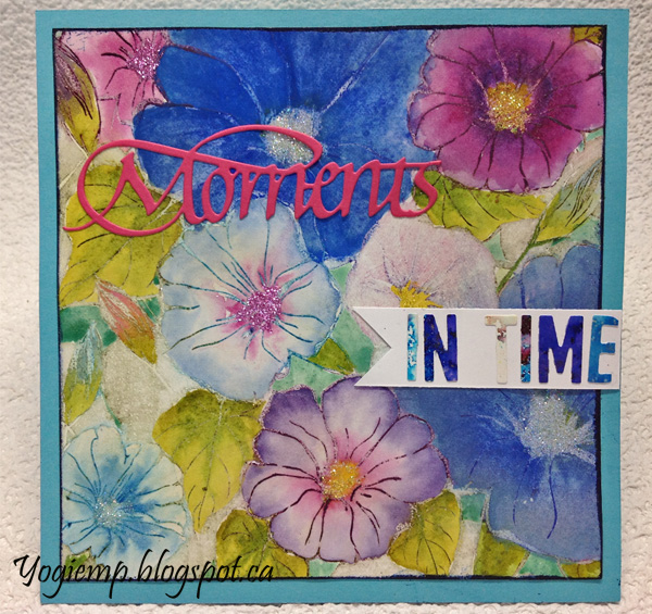 Stamped the "Morning Glory Background" on Arches watercolor paper using Versafine Black Onyx and clear embossed. Painted with Distress pads and my waterbrush. Applied Quickie glue pen in centers and sprinkled with various colored glitter. Die cut the "Moments" from a pinkish cardstock. Adhered to flower background. Trimmed down, used the black pad to edge the background and clear embossed. Adhered to card front. Raided my stash for alphabet letters to spell "In Time" (Elizabeth Craft Designs alphabet die). Adhered to white cardstock and trimmed down. Adhered to front. |