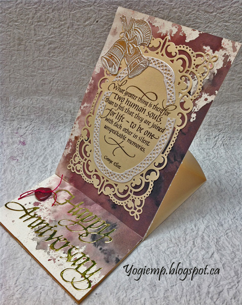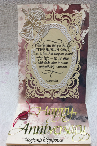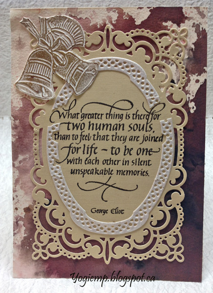 Scored and folded my cream toned cardstock. Cut another piece same size as card and adhered to front. Covered the whole front with a decorated piece of Arches Text Wove paper that I made eons ago for a calligraphy piece which didn't work out... Done with various sprays. Stamped the quote onto Classic Line Gold Pearl cardstock (Paper-Gardens.ca) using Versafine Black Onyx and clear embossed. Die cut with Spellbinders Becca Feekan "Chantilly Paper Lace" die set. Adhered to card front. Die cut the oval piece (same die set) from white cardstock, inked with Versamark and embossed with Emerald Creek "Silver Satin Pearl" embossing powder. Trimmed down where it interfered with the quote and adhered to front. Embossed the bells using Crafters Companion 3D embossing folder "Ring Out the Bells" from white cardstock misted lightly with water. Colored with Prima wax "Vintage Gold" and fussy cut around the bells. Adhered to card front. |