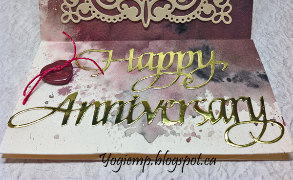 On the floor: Adhered a scrap piece of the background paper onto cream cardstock, trimmed down and adhered to floor with 3D foam tape. Die cut the "Happy Anniversary" from DoCrafts Gold Mirror cardstock. Adhered to floor. Adhered a brownish/red heart button tied with some red string using hot glue. |