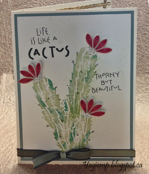 Scored and folded my Classic Linen Gold Pearl cardstock (Paper-Gardens.ca) Stamped the various cactus elements using Distress Oxide pads on a piece of the gold pearl cardstock. Dried. Did the calligraphy using a Zig marker - both the fine tip and the bullet tip and doing a monoline hand. I used the exemplar from Suzanne Cannon for her new font "Chalkline Funk" - love that style. Adhered my quilled elements. The flowers also have Prills as their centers. Trimmed down and adhered to a sage tone cardstock and then onto the card front. Adhered a piece of 2tone green ribbon. On the inside: Stamped the quote and sentiments using Distress pads in a two toned effect, and clear embossed. Die cut the "Always from a scrap of cardstock, inked with a green pad and embossed with pearlescent embossing powder. Die cut the rope border pieces (Elizabeth Craft Designs "Ropes 1" set from cream toned cardstock and inked with various browns. Adhered to inside. |