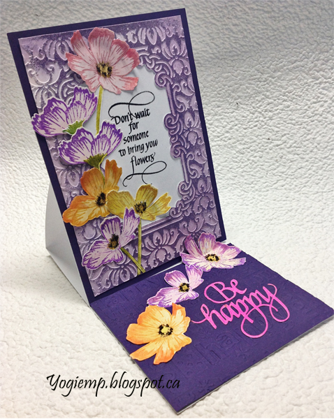 On the floor: Embossed another piece of white cardstock using the Cuttlebug "Happy Birthday" folder on purple cardstock, trimmed down and adhered to a piece of mat board then onto my floor to act as my stopper. Die cut the "Be Happy" from a pink cardstock, inked with Versamark and embossed with a pink embossing powder. Adhered the balance of the flowers I had made...