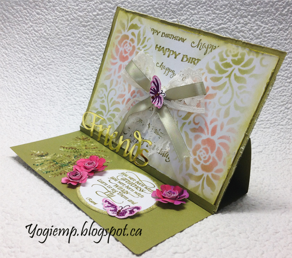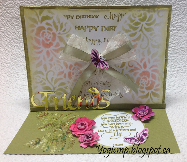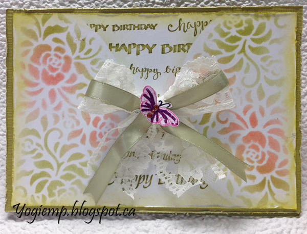 Die cut the gatefold "Elegant Roses" die and used it as a stencil coloring with Distress inks and Tim's blending brushes. Cut a mask of the die and lay over the stenciling, then stamped the various Birthday greetings in the open space using Versafine "Spanish Moss". Tied a bow using lace and satin ribbon. Stamped the butterfly on white cardstock using Distress "Picked Raspberry" moved color with a water brush and fussy cut around. Applied Quickie glue and some "Rose" glitter |