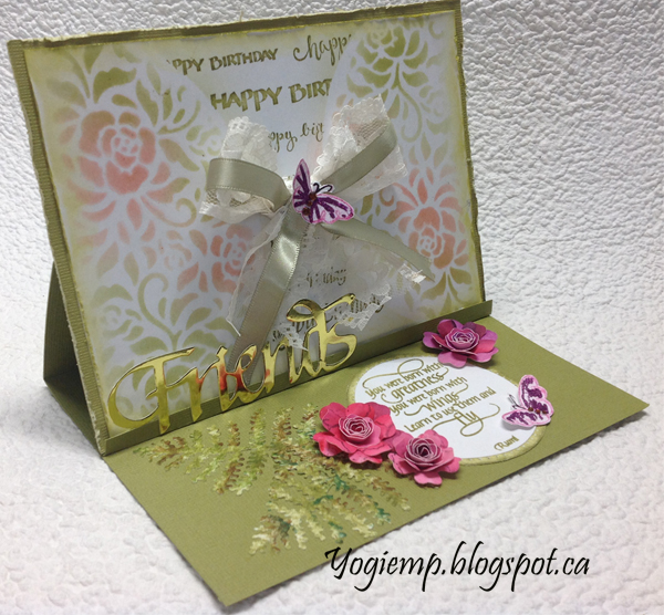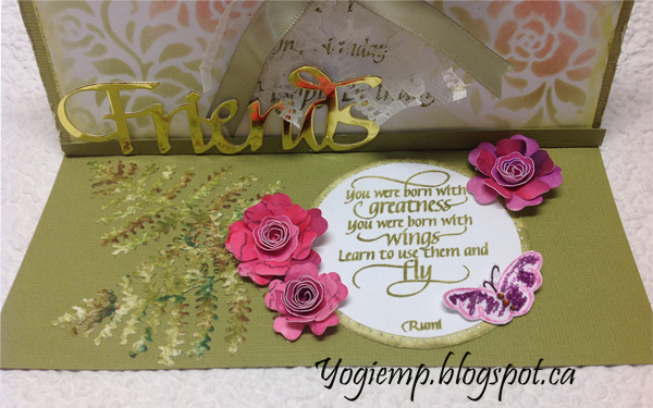 On the floor: Stamped the quote using the green and clear embossed. Adhered it to a Stitched Circle (Elizabeth Craft Designs) sponged with some green. Colored some white cardstock with various Distress greens, die cut the Ostrich Ferns and adhered to floor. Raided my stash for the roses (Die-Namics "Hybrid Heirloom Rose"). Added another of the butterflies and adhered mini rhinestones to both bodies. Die cut the "Friends" from a DoCraft gold metallic cardstock. Adhered to a piece of the green cardstock and adhered to floor to act as my stopper.