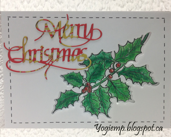 The technique calls fro a rubber stamp and die set. Since I don't own the die for this holly branch I cut my top layer with my electronic cutter... Stamped the holly (Sheena Douglas "Holly" set) on white cardstock using Versafine Black Onyx and clear embossed. Painted with watercolors. Electronically cut the upper layer in the same orientation as the bottom layer. Cut a piece of fun foam and adhered to the top layer then onto the bottom layer, then onto the card front. Doodled some faux stitching using a black Zig marker. Die cut the "Merry Christmas" from an Oriental Menu that was mailed to me. I was about to throw it out, but said to myself, it's a nice glossy heavy weight cardstock with really nice food images... I love the way the die cuts turned out. It was a 6page menu so have lots of die cuts BIG GRIN. |