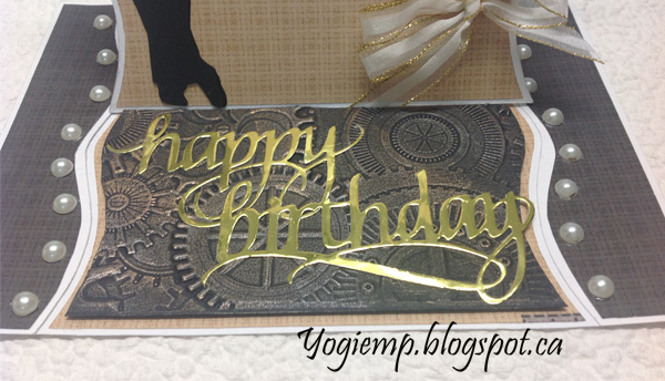 On the floor: Dry embossed the gears (Tim's 3D "Mechanics" embossing folder) on black cardstock. Colored with Prima Marketing Colored Wax. Adhered to floor. Die cut the "Happy Birthday from DoCraft Gold Mirror cardstock, adhered to floor. Final touch adhered medium sized white pearls along both curves.
