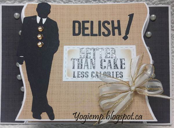 Cut scrapbook paper (Paper Wishes misc 72pce scrap paper pack) and adhered to card leaving a small order around everything. Electronically cut the guy from white cardstock and colored with a black marker, layered onto another white cut piece, then onto my card front. Raided my font stash (Elizabeth Craft Designs alphabet die cuts) to write the word "Delish". Then added the exclamation mark. Stamped the sentiment using Just Rite "Brayton Font" alphabet set, inking with Versafine Black Onyx and clear embossing on white cardstock. Die cut with Elizabeth Craft Designs "Stitched Rectangles" die set. Sponged around edges with a dirty brown sponge. Adhered to front. Tied a multiple loop bow. |