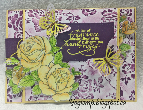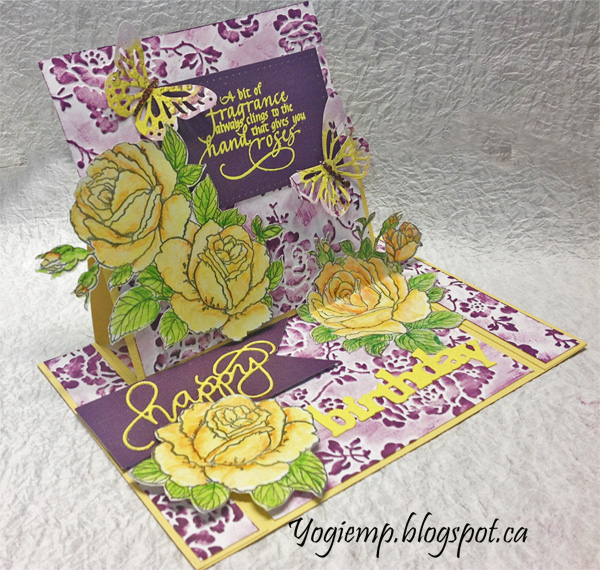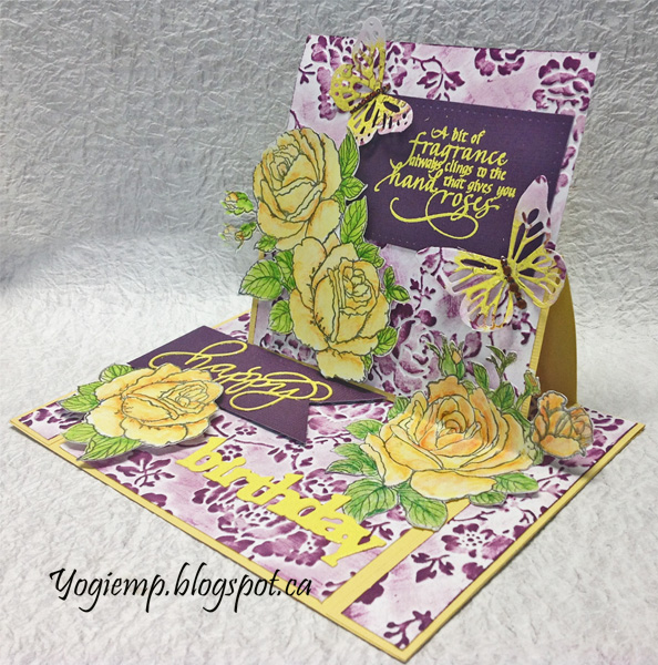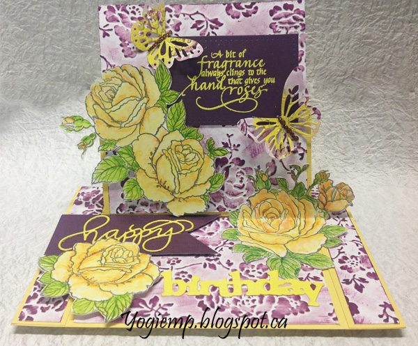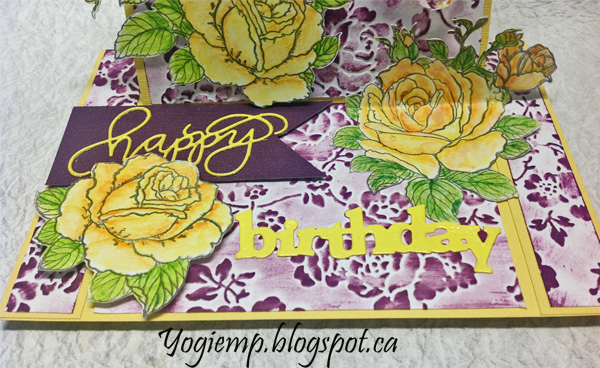 On the floor: Die cut the "Happy Birthday from yellow cardstock, inked with Versamark and embossed with the yellow embossing powder. Adhered the script word to the purple cardstock, cutting a picot edge and adhering a piece of mat board underneath and then onto the card floor to act as my stopper. Adhered a couple more of the roses and the "Birthday word"