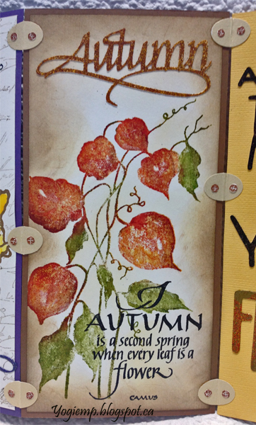 Stamped the "Flower Lanterns" Penny Black, using Distress pads and my Tim's Stampin Platform. Moved color around with a paintbrush. Sponged some browns around the edges. Stamped the quote with the black and clear embossed. Die cut the "Autumn" from a tan cardstock, inked with Versamark and embossed with Emerald Creek "Thanksgiving" embossing powder. Trimmed down and adhered to a mid toned brown cardstock.