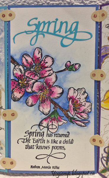 Stamped the "Cherry Blossoms" Local King Rubber using the black and clear embossing. Painted with watercolors. Stamped the quote with the black and clear embossed. Die cut the "Spring" from the aqua cardstock. Trimmed down and adhered to a deep blue cardstock. |