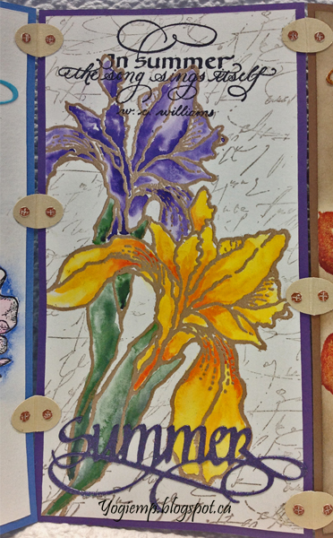Stamped the "Jumbo Iris" Inkadinkado with Versafine Toffee and embossed with gold embossing powder. Masked the 1st Iris and stamped it again. Painted with watercolors. Masked both Iris and stamped the background (Impression Obsession "Script") using Distress "Pumice Stone". Stamped the quote with the black and clear embossed. Die cut the "Summer" from a purple cardstock, inked with Versamark and embossed with Emerald Creek "Mardis Gras" then re-embossed with "Frosted Plum" Trimmed down and adhered to a purple cardstock. |