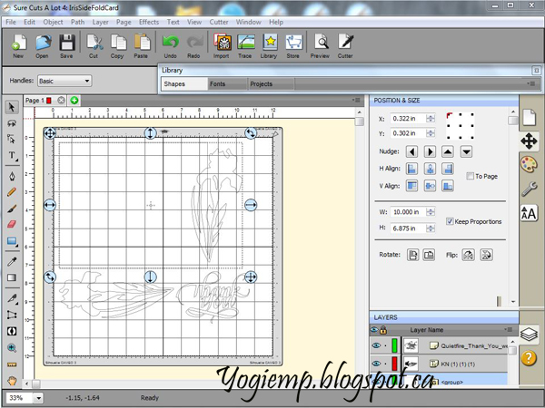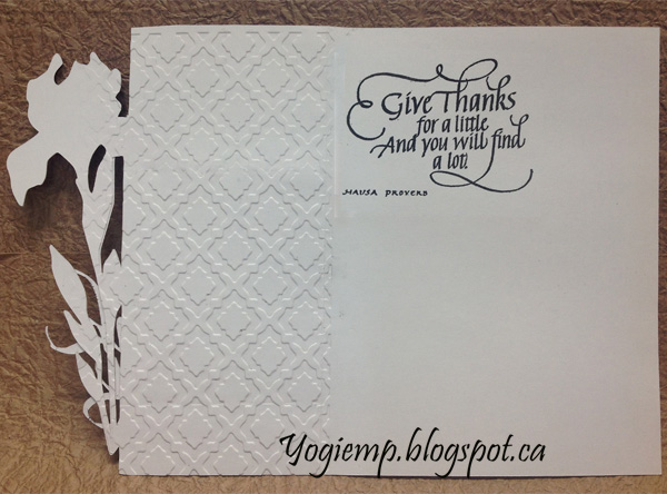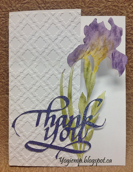 Used a basic rectangle shape and increased it to 7"h x 8"w. Placed the iris overlapping the right edge and having an overall width of 10". Copied and pasted a 2nd Iris for later. Grouped the 1st Iris with the rectangle and then welded them together. If you are using a 12 x 12 cardstock everything can go on one page as the image. I used an 8.5 x 11" white cardstock so had to add a page with my other details. Cut the card/Iris. Scored and folded to make it a 5 x 7" card. Embossed the tile background (Elizabeth Craft Designs "Trendy Tiles") only on the front of the card. Electronically cut that 2nd Iris and the Thank You which I had sized to approx 4"w from white cardstock. Inked the word with some Distress "Dusty Concord" and embossed with Emerald Creek "Mardi Gras" embossing powder. Has a nice glittery sheen to it. Colored the Iris with a few shades of green both direct to paper and sponging to give variations in the colors. The flower I inked with "Mustard Seed" near the base of the flower and then with the Concord on the rest of the flower. Adhered the flower and the word to the front of the card. |