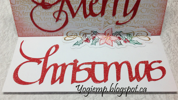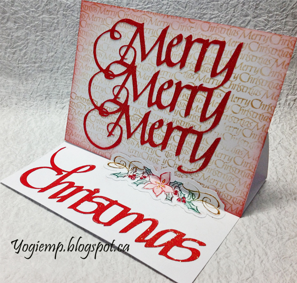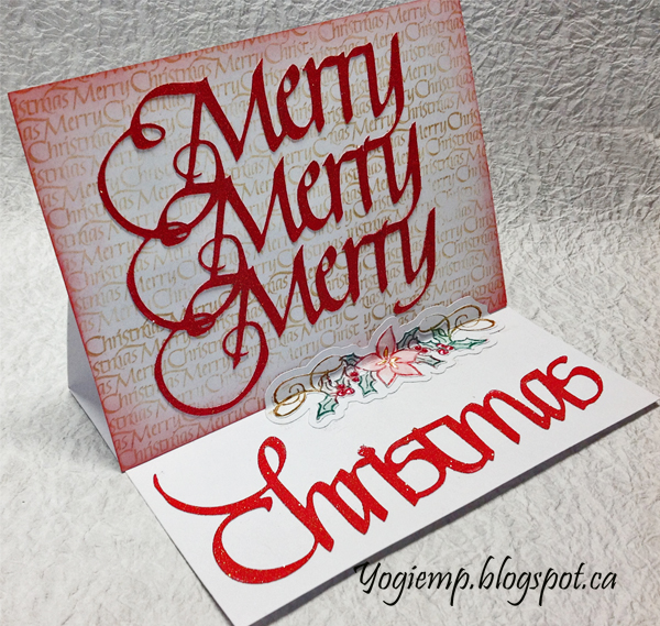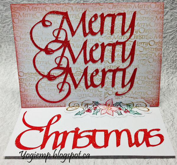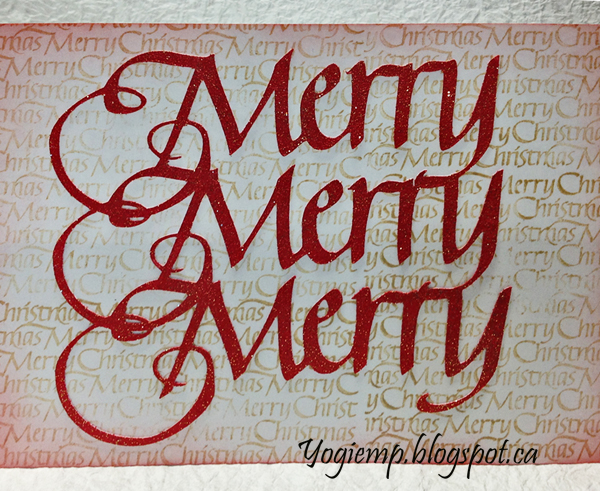 Opened my SCAL (Sure Cuts A Lot) software and the digi file. Ungrouped. Copied and pasted the "Merry" 3 times, moving the words so they touched each other. Grouped all and increased the size to 5"w x 4.5"h. Cut from white cardstock and while still on my mat, colored direct to paper with the Candied Apple. Removed from my mat and embossed with Emerald Creek "Chinese New Year" embossing powder. Adhered words to front. |