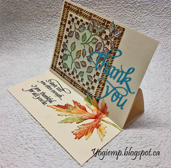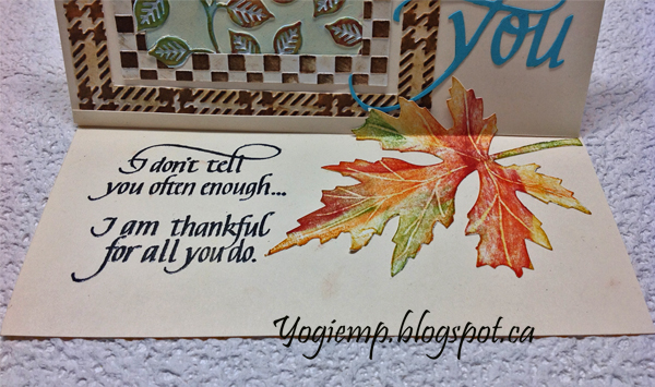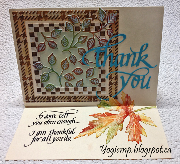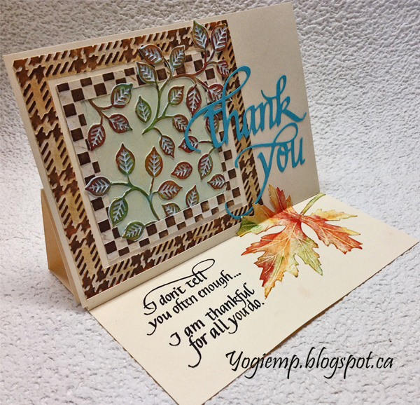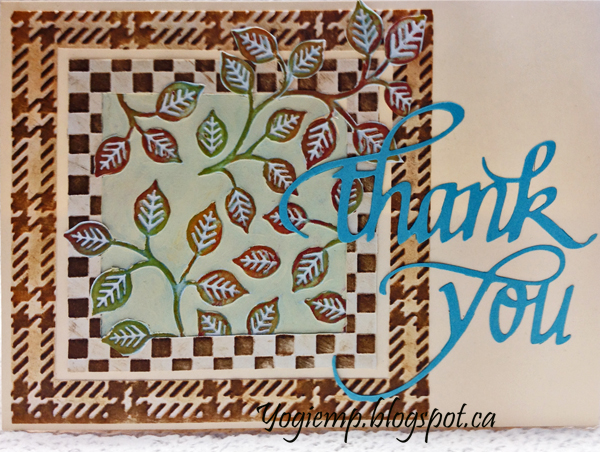 front. Dry embossed the little squares (Cuttlebug "Every Day Bundle") and the plaid type design (Cuttlebug "Winter Wonderland" set) from cream cardstock. Colored with various brown Distress pads. Cut out the frame shapes. Dry embossed the leafy piece (Sizzix "Fall" set). colored with the Distress pads and fussy cut around the leaves to fit the frame. Adhered under smaller frame having several branched overlay on top of the frame. Adhered all to the front. Die cut the Thank You from a blue cardstock. |
