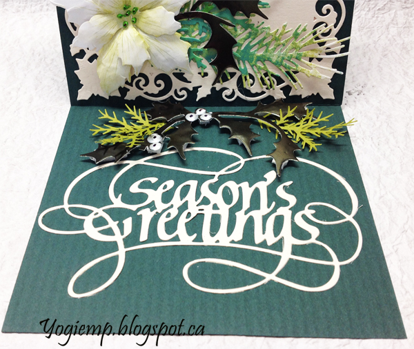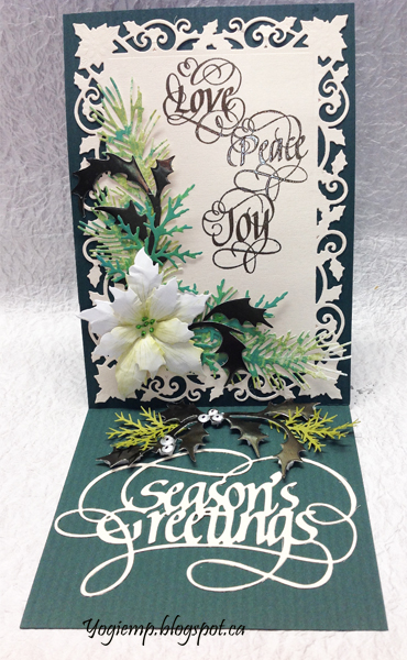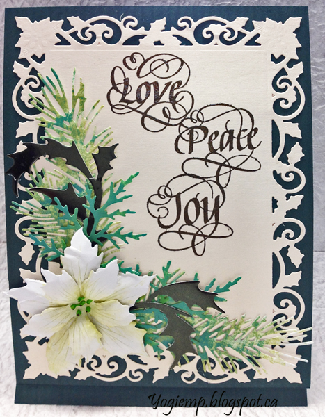 Cut another piece same size and adhered to front. Die cut Spellbinder's "Holly Frame" from a White/Gold cardstock (Paper-Garden.ca). Adhered to the front. Die cut the various greens from Distress colored/decorated cardstock (Impression Obsession "Fall Branch" and Dee's Distinctively "Cedar Sprig LG") and Cuttlebug Cut/Emboss "Holly Whisper" from a dark green mirror cardstock. Die cut the poinsettia, colored with Distress, tooled and assembled and detailed with a Derwent Inktense pencil. Added Liquid Pearls green dots. Adhered the flower and leaves to the card front. Stamped the words using Versafine Black Onyx and clear embossed. |