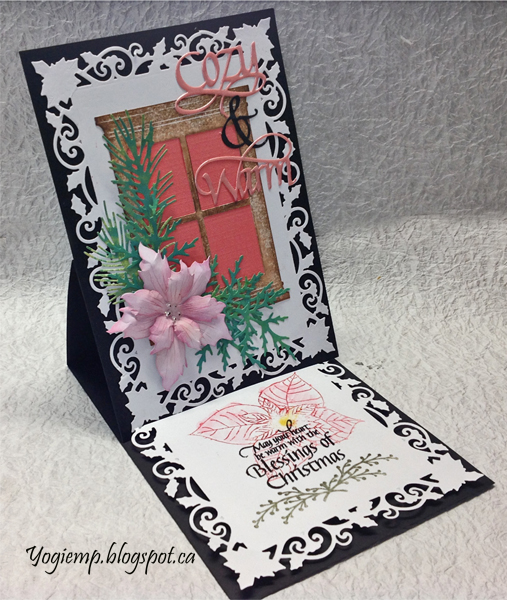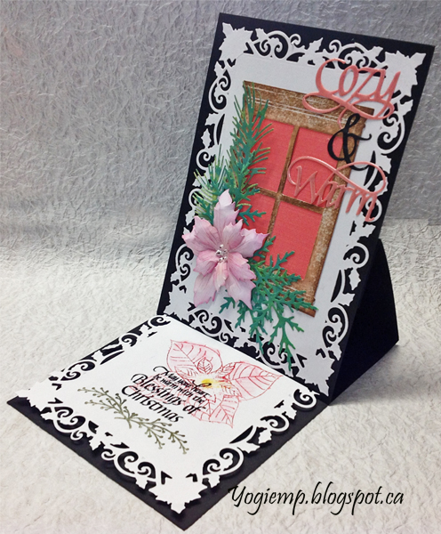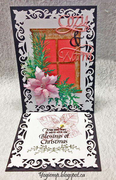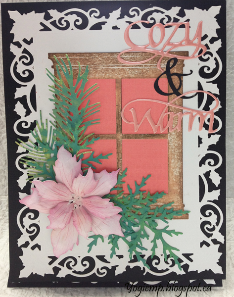 Cut another piece same size and adhered to front. Die cut Spellbinder's "Holly Frame" from white cardstock twice. Adhered one to the front. Die cut the window (Memory Box "Grand Madison Window") from white cardstock and colored direct to paper with various Distress brown pads. Cut a piece of coral toned textured cardstock to adhere behind window and adhered both to card front. Die cut the various greens from Distress colored/decorated cardstock (Impression Obsession "Fall Branch" and Dee's Distinctively "Cedar Sprig LG"). Die cut the poinsettia, colored with Distress, tooled and assembled and detailed with a Derwent Inktense pencil. Added Liquid Pearls "White Opal" dots. Adhered the flower and leaves to the card front. Die cut the "Cozy, Warm" from a pink toned cardstock, inked with Versamark and embossed with Pearlescent embossing powder. Die cut the Ampersand from black cardstock. Adhered all the words to the front. |