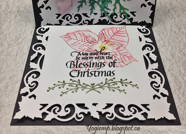 On the floor: Stamped the Poinsettia on the 2nd Holly Frame die cut using my Tim's Stampin Platform and Distress pads, then moved color with a water brush. Stamped the quote with Versafine Black Onyx and the sprig with "Spanish Moss" and clear embossed. Cut the floor down to size and adhered to floor with 3D foam tape.