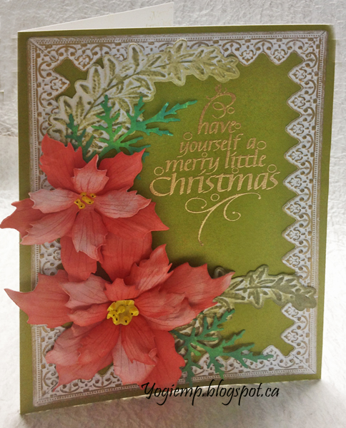 Die cut Tim's "Mini Provincial" cut/emboss from white cardstock several times. Applied Prima "Vintage Gold" art wax using my finger... Spliced and adhered to front. Die cut Tim's "Laurel" cut/emboss, sponged with Distress "Shabby Shutters" and then with my finger and the Vintage Gold. set aside. Die cut Dee's Distinctively "Cedar Sprig Large" from white cardstock and colored with Distress Oxide greens. set aside. Die cut Tim's Tattered Poinsettia a couple times from white cardstock. Colored with Distress Oxides direct to paper using "Candied Apple", lightly and then more firmly giving variations in color. Used a Derwent Intense pencil "Carmine Pink" to lightly add streaks in each petal. Tooled each petal with a large balled tool on my foam mat. Assembled and added Liquid Pearls "Buttercup" dots to the center. set aside to dry and added a black dot on each yellow dot with a Sharpie pen. Stamped the quote using Versafine Toffee and embossed with Queen's Gold embossing powder. Assembled and adhered the flowers and leaves. |