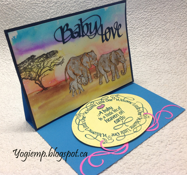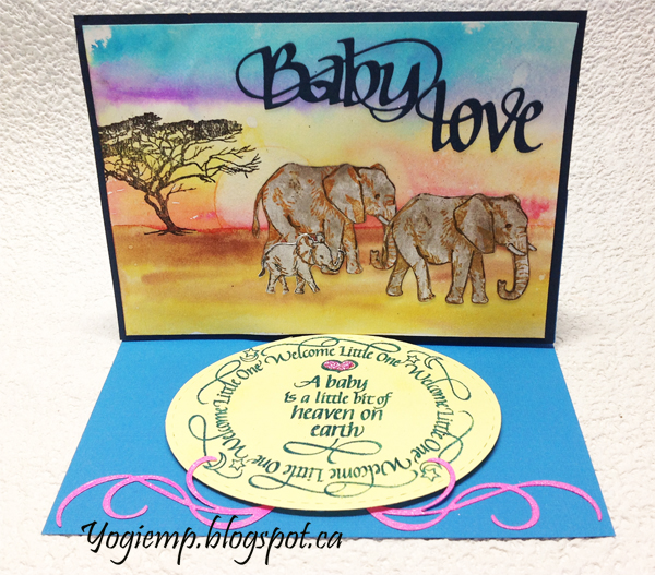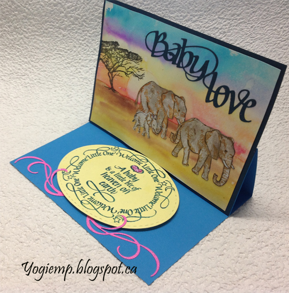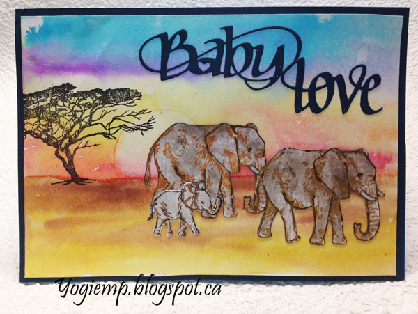 Scored and folded my blue textured cardstock to create the easel structure. Cut another piece same size as card from dark blue cardstock and adhered to front. Created the landscape background on CP watercolor Paper. Wetting the paper, dribbled the various watercolors. When dry, lifted off the circular area behind one of the large elephants to mimic a rising sun. Stamped the tree (Local King Rubber "Tree 1") using Versafine Black Onyx and clear embossed. Created silhouette files for the elephants (Hero Arts "Color Layering Elephants"). Cut with my electronic cutter and stamped with various Distress colors. Adhered to background. Trimmed down and adhered to card front. Die cut the "Baby Love" from dark blue cardstock and adhered to front. |