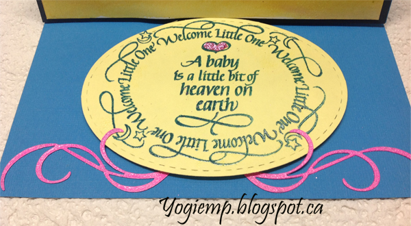 On the floor: stamped the quote onto yellow cardstock using Versafine "Blue Lagoon" and clear embossing. Die cut with Elizabeth Craft Designs "Stitch Ovals" die set. Adhered to floor with 3D foam tape. Added a touch of pink glitter to the heart Die cut the flourishes from a pink cardstock and adhered to floor.